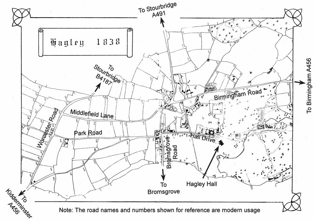 This article refers to the Tithe map of Hagley published in 1838, which is reproduced in more detail below. Click on the map to see an enlarged version.