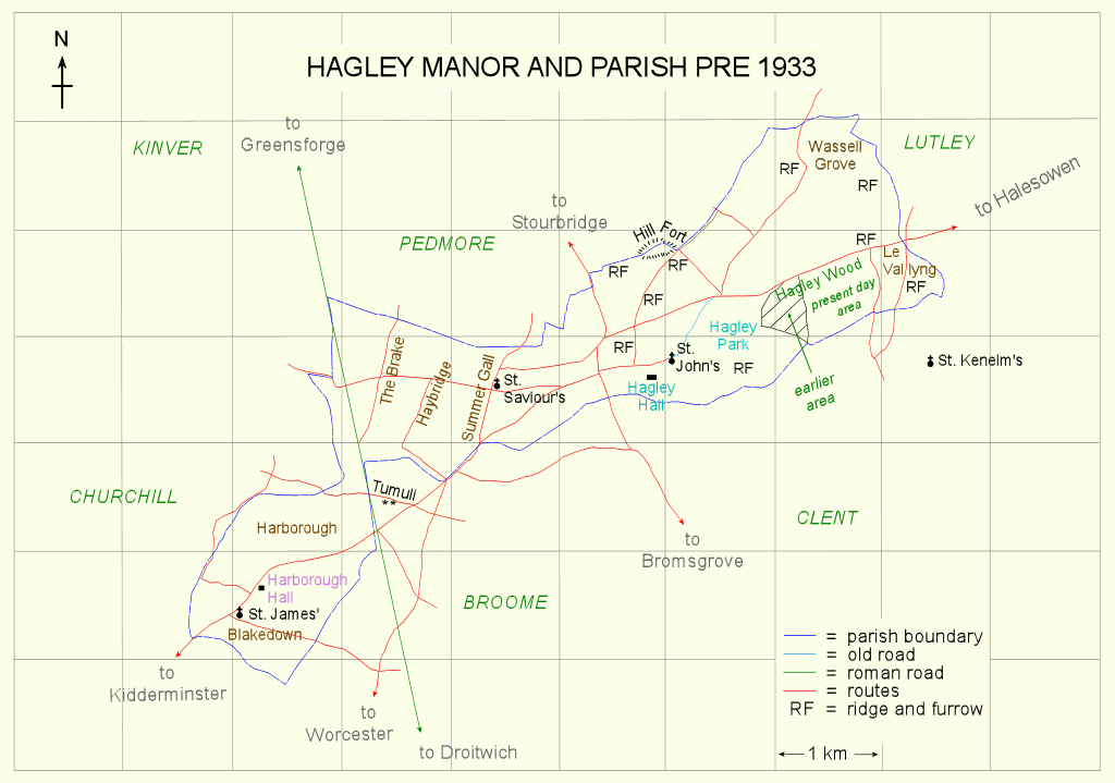 Geographically the parish and manor prior to 1933, when Blakedown was taken from Hagley and added on to Churchill, is the area considered from c. 960AD. Before 960 it is very probable that Hagley was part of a larger Clent, and the phrase “Hagley district” is used to cover Saxon, Roman and pre-historical periods.